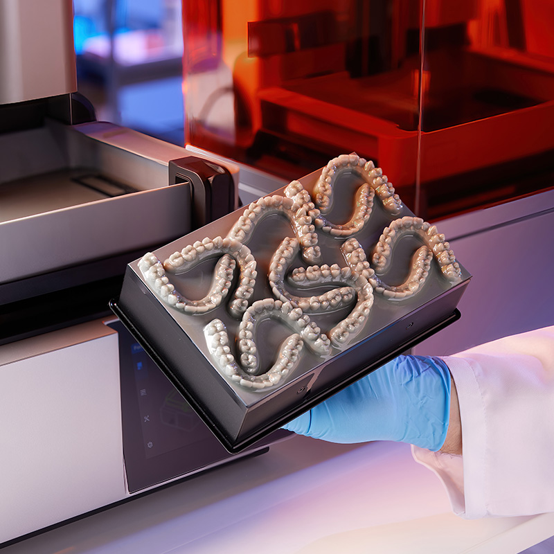 Bekijk hoe een flex bouwplaat van de Formlabs Form 4L vol met dentale modellen in 11 minuten geprint is, met maar 5 minutes nabewerking in de Formlabs Form Wash en Cure.